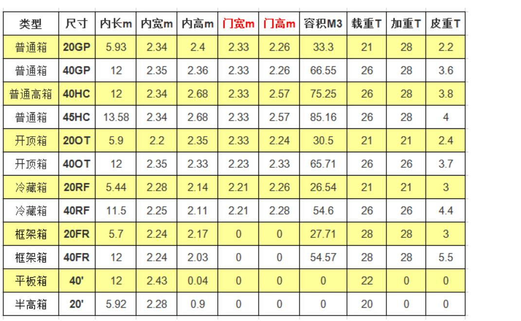 1. 集裝箱上會標示有:箱號,箱重,限重等信息。2. 所有集裝箱的配貨毛重都以船公司最后確認為準,不同船公司可能給出的配重都不一樣。比如船公司A給出20’FR柜可以裝載到28噸,船公司B給出20’FR柜可以裝載到26噸。3. 一般普柜和開頂柜的貨物寬度不宜超過2.28米,否則可能裝不上去,寬度超過2.3米的需要使用框架柜。