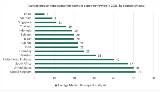 Container xChange和Fraunhofer CML的一項(xiàng)研究發(fā)現(xiàn),2021年,集裝箱在中國(guó)倉庫停留的平均時(shí)間為5天,而2020年為16天。其他主要出口國(guó),包括越南 新加坡 泰國(guó)和印度尼西亞,集裝箱在倉庫停留平均時(shí)間分別為9天 11天 16天和19天。2021年,集裝箱在倉庫停留時(shí)間最長(zhǎng)的是美國(guó)和英國(guó),其平均停留時(shí)間分別為50和51天。相比之下,集裝箱在德國(guó)的停留時(shí)間為25天。