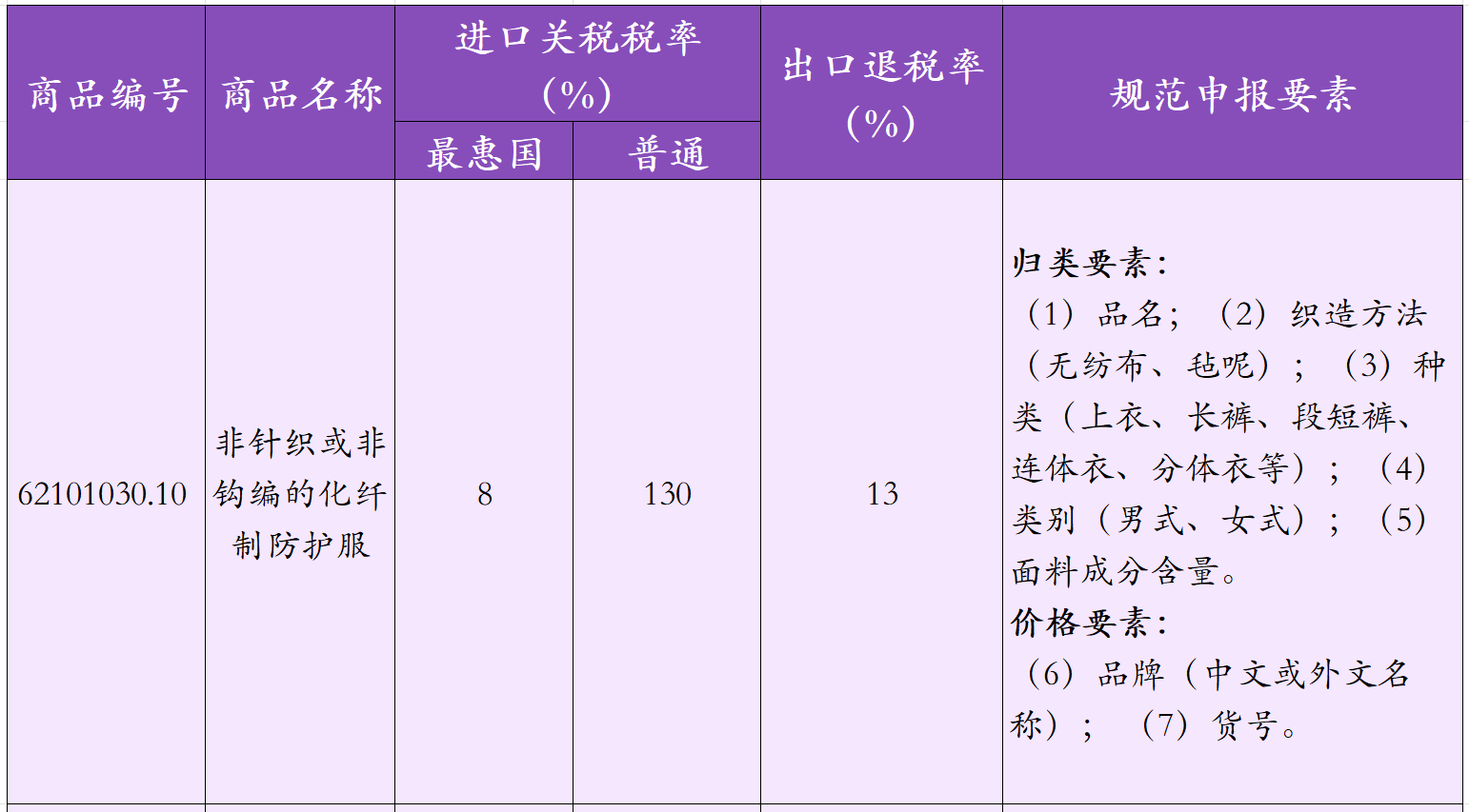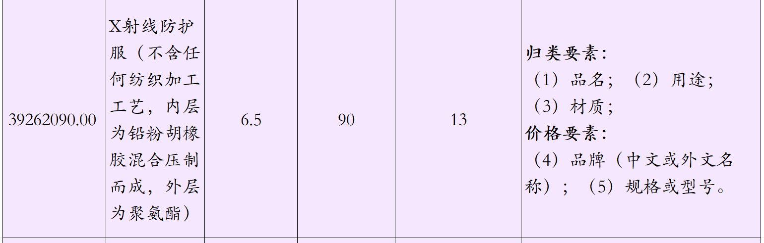 還有一些特殊的防護(hù)服,如醫(yī)院里放射性檢查工作人員穿著的X射線防護(hù)服,該防護(hù)服不含任何紡織加工工藝,分為內(nèi)層和包裹層兩部分組成,內(nèi)層為鉛粉和橡膠混合壓制成片,制成身體所需防護(hù)部位的樣式,內(nèi)層被聚氨酷片包裹,聚氨酷片構(gòu)成該商品塑料的基本特征這類(lèi)防護(hù)服可以保護(hù)人體的骨髓及造血系統(tǒng)、生殖器官、甲狀腺和內(nèi)臟等重要器官,減少X射線對(duì)人體的損害。常見(jiàn)的防護(hù)服可能涉及的歸類(lèi)及規(guī)范申報(bào)要素如下: