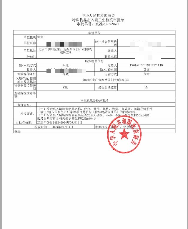 1.客戶提供情況說明,產(chǎn)品分析證書,風險評估報告。在生物試劑進口清關之前辦理特殊生物試劑許可證,一般在5個工作日內(nèi)能完成《出/入境特殊物品衛(wèi)生檢疫核銷單》的申請。